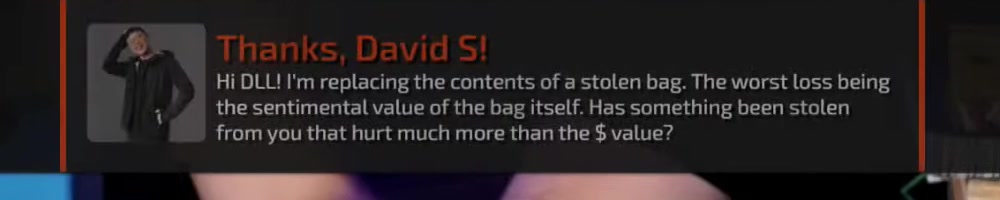 Hi DLL! I'm replacing the contents of a stolen bag. The worst loss being