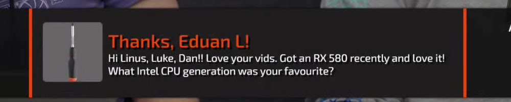 Hi Linus, Luke, Dan!! Love your vids. Got an RX 580 recently and love it!