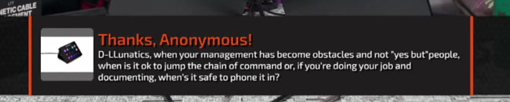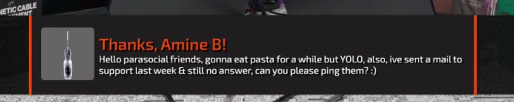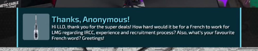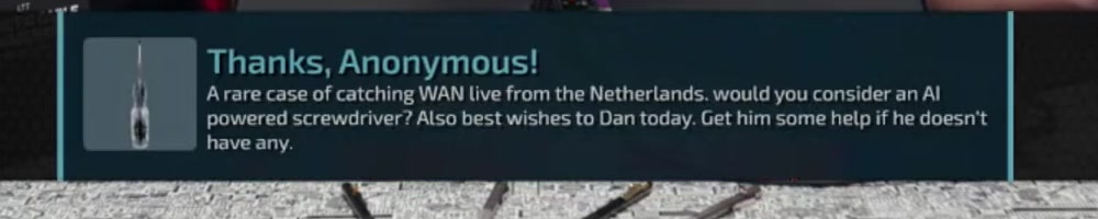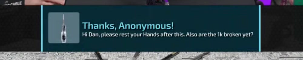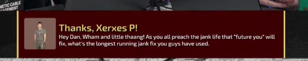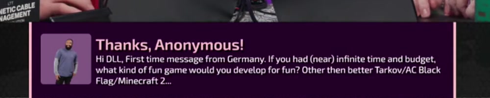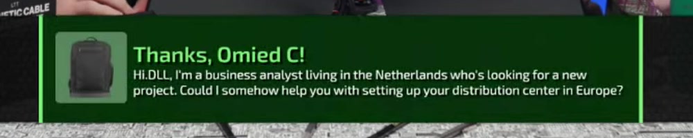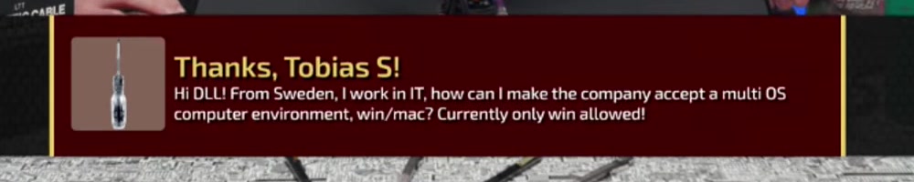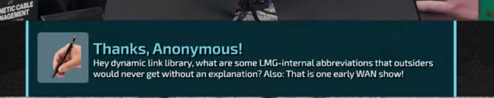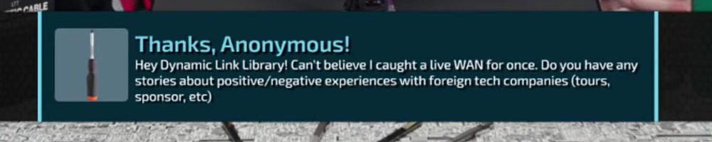 Anonymous message Thanks, Anonymous! Hey Dynamic Link Library! Can't believe I caught a live WAN for once. Do you have any stories about positive/negative experiences with foreign tech companies (tours, sponsor, etc) Timestamp