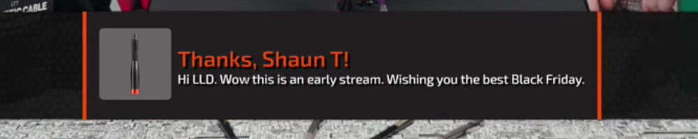 Shaun T message Thanks, Shaun T! Hi LLD. Wow this is an early stream. Wishing you the best Black Friday. Timestamp