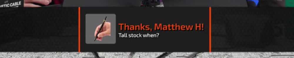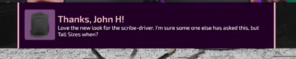John H message Thanks, John H! Love the new look for the scribe-driver. I'm sure some one else has asked this, but Tall Sizes when? Timestamp