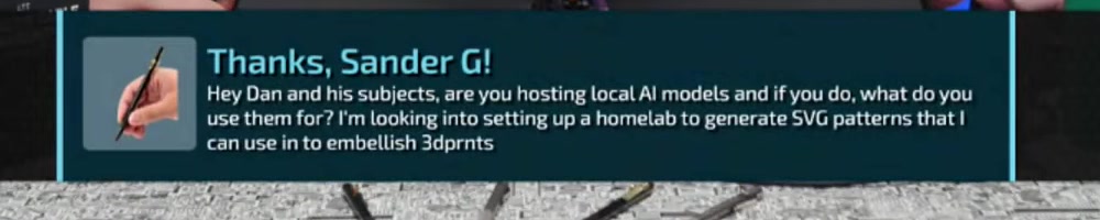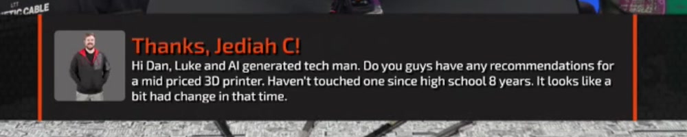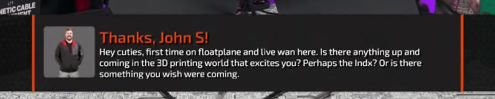 John S message Thanks, John S! Hey cuties, first time on floatplane and live wan here. Is there anything up and coming in the 3D printing world that excites you? Perhaps the Indx? Or is there something you wish were coming. Timestamp