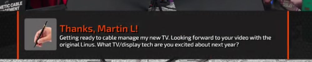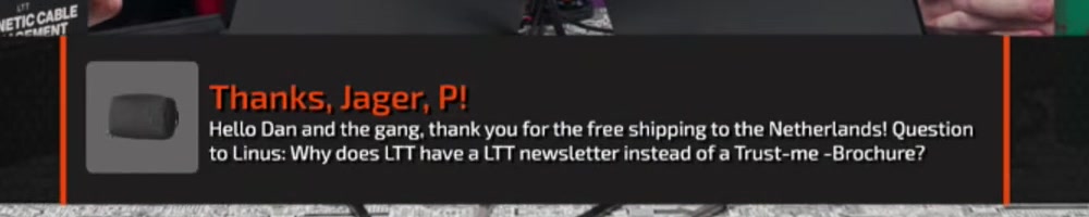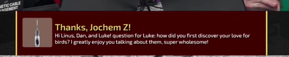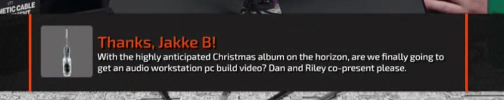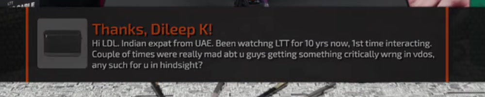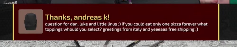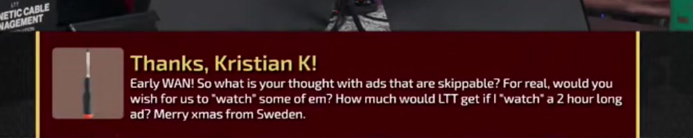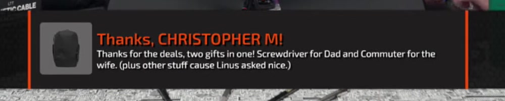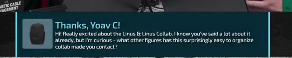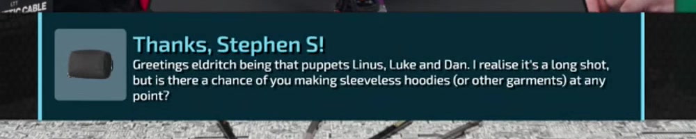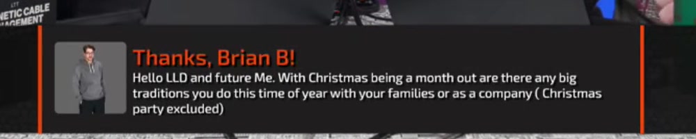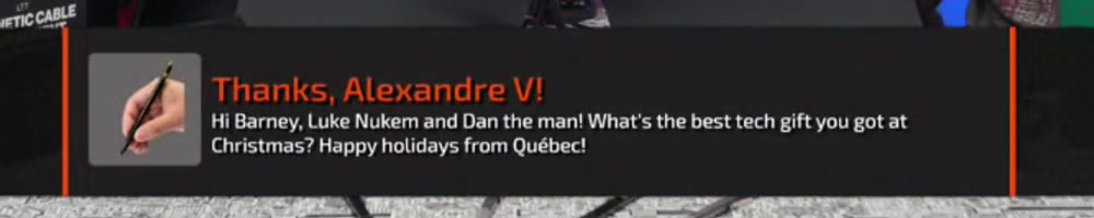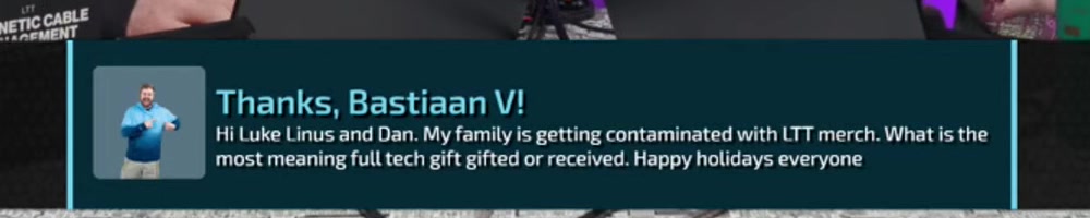 Bastiaan V message Thanks, Bastiaan V! Hi Luke Linus and Dan. My family is getting contaminated with LTT merch. What is the most meaning full tech gift gifted or received. Happy holidays everyone Timestamp