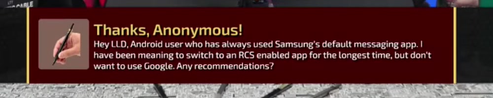 Anonymous message Thanks, Anonymous! Hey LLD, Android user who has always used Samsung's default messaging app. I have been meaning to switch to an RCS enabled app for the longest time, but don't want to use Google. Any recommendations? Timestamp