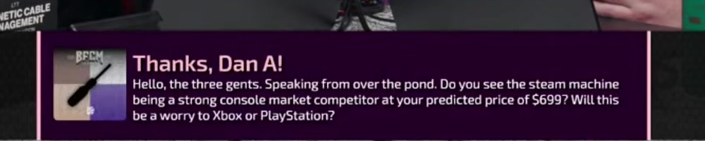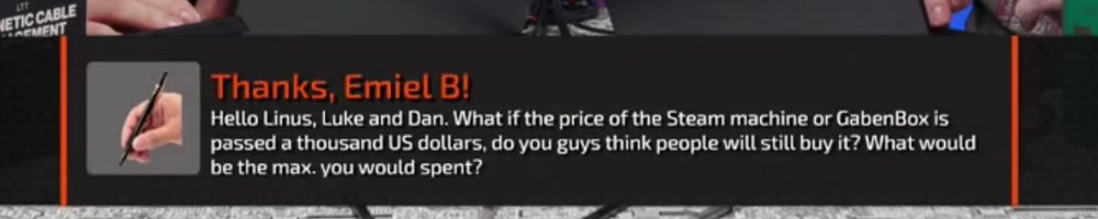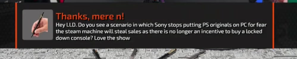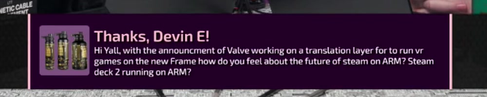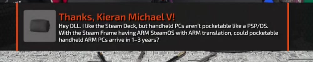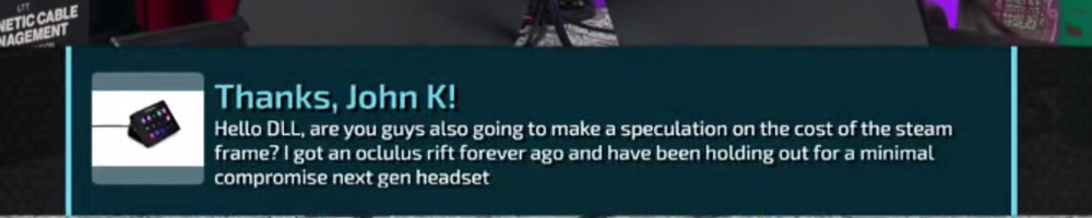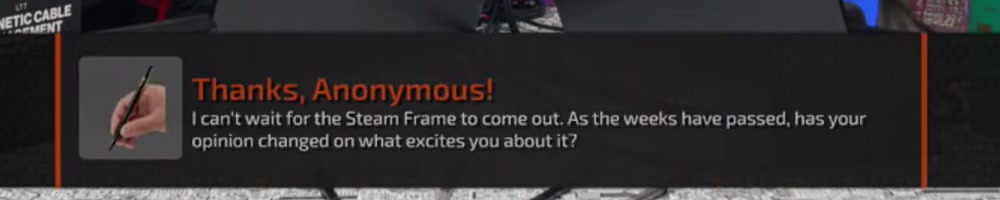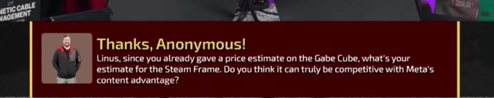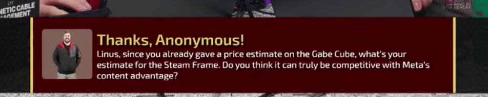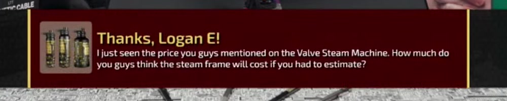 Logan E message Thanks, Logan E! I just seen the price you guys mentioned on the Valve Steam Machine. How much do you guys think the steam frame will cost if you had to estimate? Timestamp