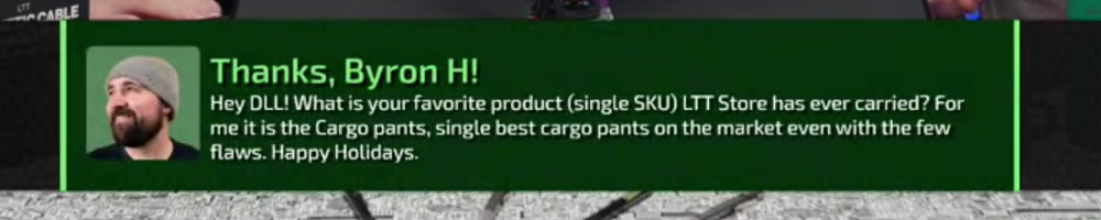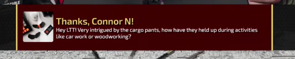 Connor N message Thanks, Connor N! Hey LTT! Very intrigued by the cargo pants, how have they held up during activities like car work or woodworking? Timestamp