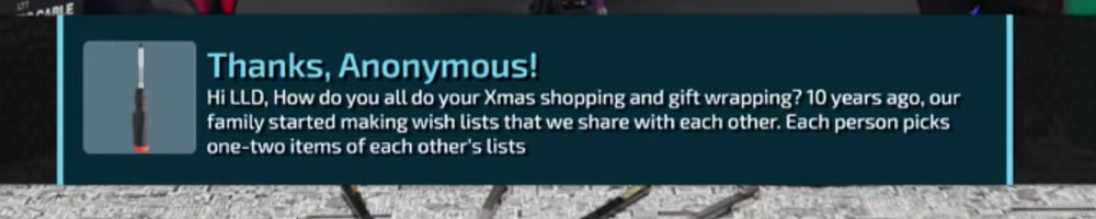 Anonymous message Thanks, Anonymous! Hi LLD, How do you all do your Xmas shopping and gift wrapping? 10 years ago, our family started making wish lists that we share with each other. Each person picks one-two items of each other's lists Timestamp