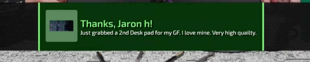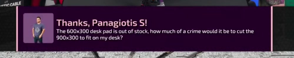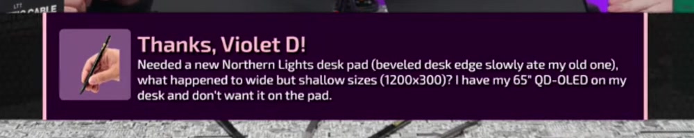 Violet D message Thanks, Violet D! Needed a new Northern Lights desk pad (beveled desk edge slowly ate my old one), what happened to wide but shallow sizes (1200x300)? I have my 65" QD-OLED on my desk and don't want it on the pad. Timestamp