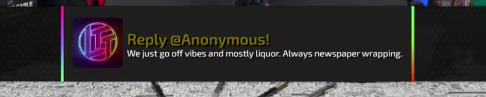 Anonymous reply Reply @Anonymous! We just go off vibes and mostly liquor. Always newspaper wrapping. Timestamp