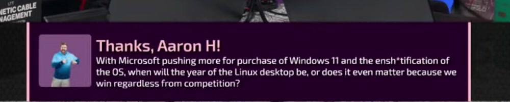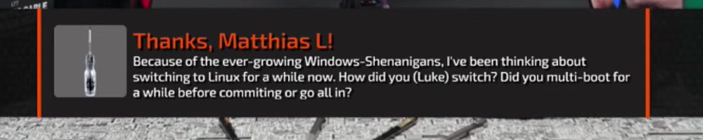 Matthias L message Thanks, Matthias L! Because of the ever-growing Windows-Shenanigans, I've been thinking about switching to Linux for a while now. How did you (Luke) switch? Did you multi-boot for a while before commiting or go all in? Timestamp