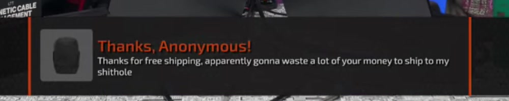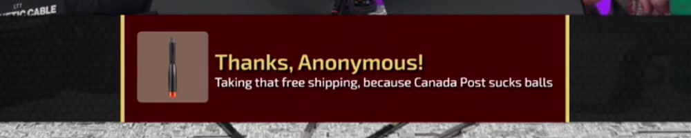 Anonymous message Thanks, Anonymous! Taking that free shipping, because Canada Post sucks balls Timestamp