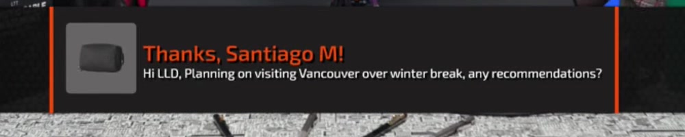 Santiago M message Thanks, Santiago M! Hi LLD, Planning on visiting Vancouver over winter break, any recommendations? Timestamp