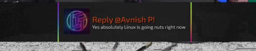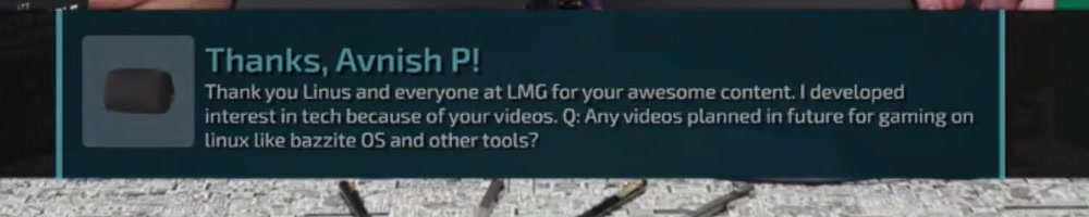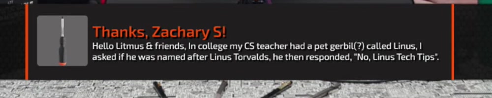 Zachary S message Thanks, Zachary S! Hello Litmus & friends, In college my CS teacher had a pet gerbil(?) called Linus, I asked if he was named after Linus Torvalds, he then responded, "No, Linus Tech Tips". Timestamp