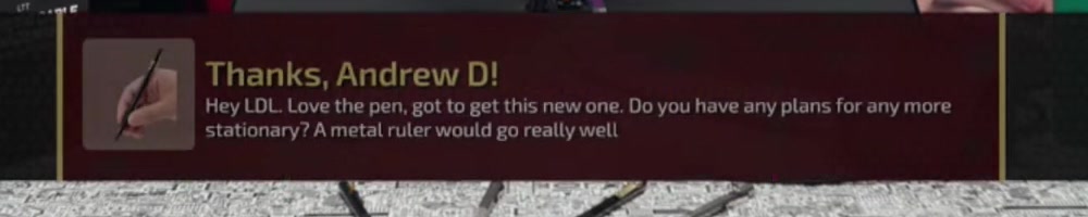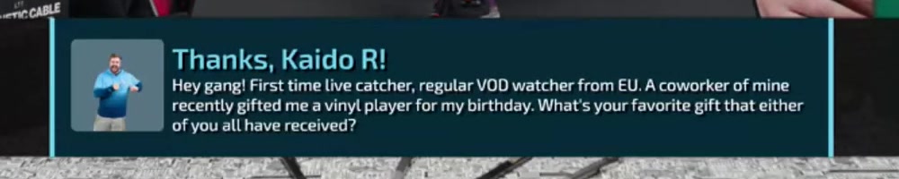 Kaido R message Thanks, Kaido R! Hey gang! First time live catcher, regular VOD watcher from EU. A coworker of mine recently gifted me a vinyl player for my birthday. What's your favorite gift that either of you all have received? Timestamp