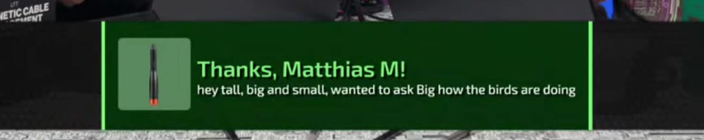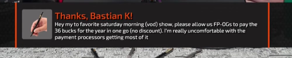 Bastian K message Thanks, Bastian K! Hey my to favorite saturday morning (vod) show, please allow us FP-OGS to pay the 36 bucks for the year in one go (no discount). I'm really uncomfortable with the payment processors getting most of it Timestamp