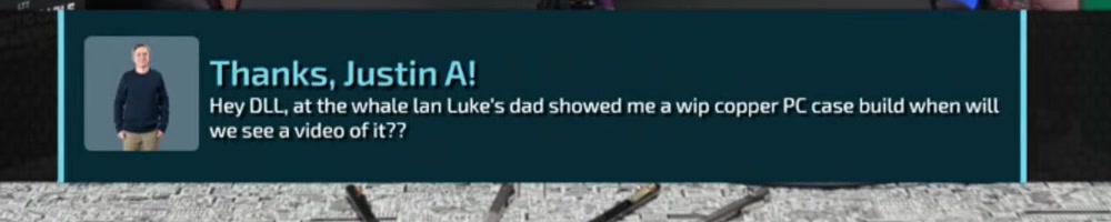 Justin A message Thanks, Justin A! Hey DLL, at the whale lan Luke's dad showed me a wip copper PC case build when will we see a video of it?? Timestamp