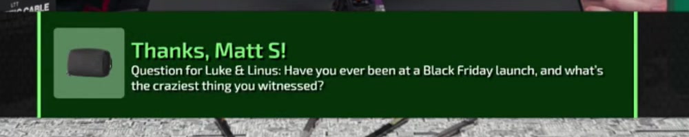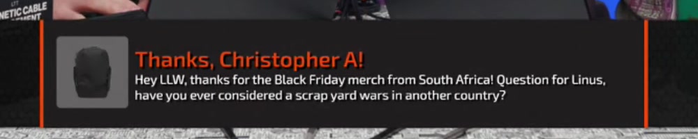 Christopher A message Thanks, Christopher A! Hey LLW, thanks for the Black Friday merch from South Africa! Question for Linus, have you ever considered a scrap yard wars in another country? Timestamp