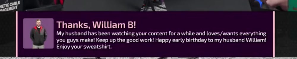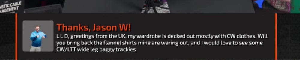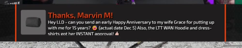Marvin M message Thanks, Marvin M! Hey LLD - can you send an early Happy Anniversary to my wife Grace for putting up with me for 15 years? (actual date Dec 5) Also, the LTT WAN Hoodie and dress- shirts got her INSTANT approval! Timestamp