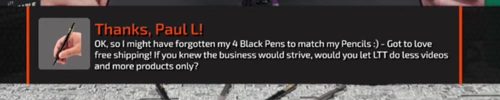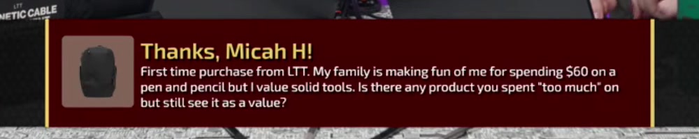 Micah H message Thanks, Micah H! First time purchase from LTT. My family is making fun of me for spending $60 on a pen and pencil but I value solid tools. Is there any product you spent "too much" on but still see it as a value? Timestamp