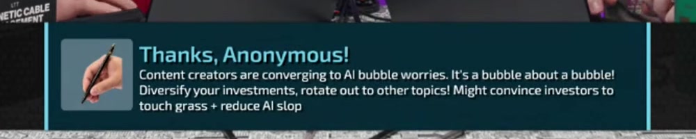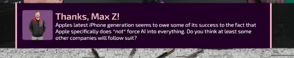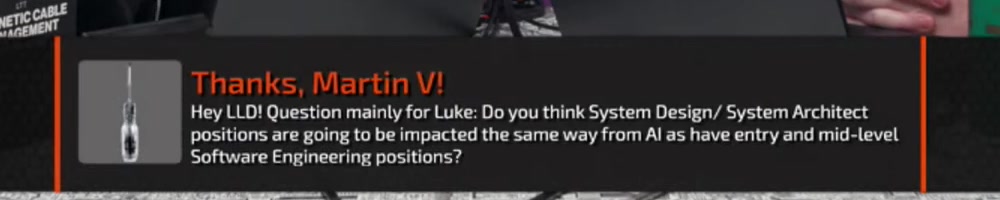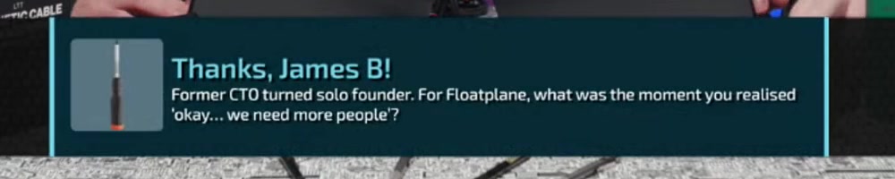 Sebastien B message Thanks, Sebastien B! Given the advancement of Al for developers (I'm thinking of Cursor and Google Antigravity) how will this impact Floatplanes hiring? Timestamp