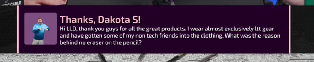 Dakota S message Thanks, Dakota S! Hi LLD, thank you guys for all the great products. I wear almost exclusively Itt gear and have gotten some of my non tech friends into the clothing. What was the reason behind no eraser on the pencil? Timestamp