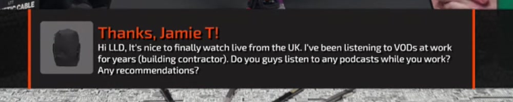 Jamie T message Thanks, Jamie T! Hi LLD, It's nice to finally watch live from the UK. I've been listening to VODs at work for years (building contractor). Do you guys listen to any podcasts while you work? Any recommendations? Timestamp