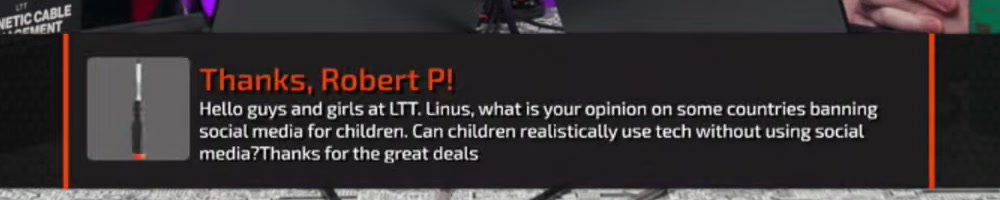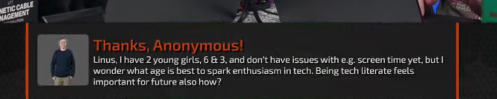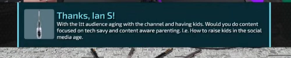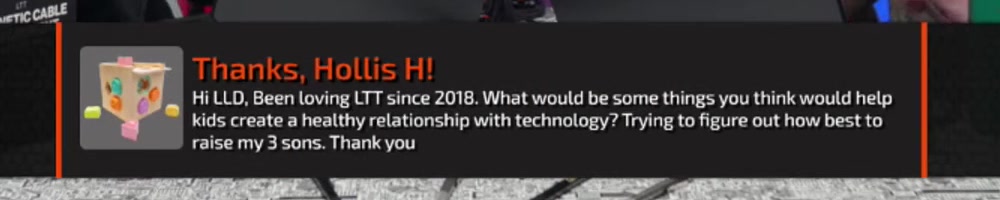 Hollis H message Thanks, Hollis H! Hi LLD, Been loving LTT since 2018. What would be some things you think would help kids create a healthy relationship with technology? Trying to figure out how best to raise my 3 sons. Thank you Timestamp