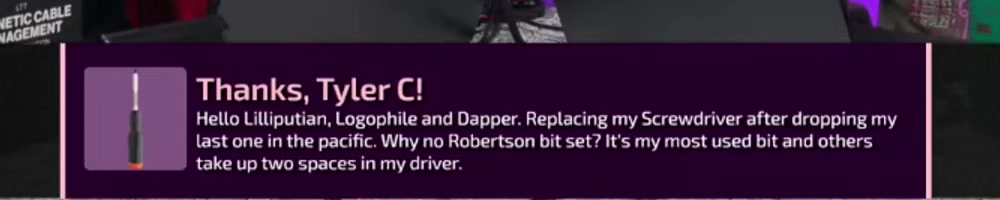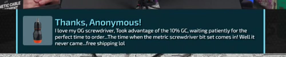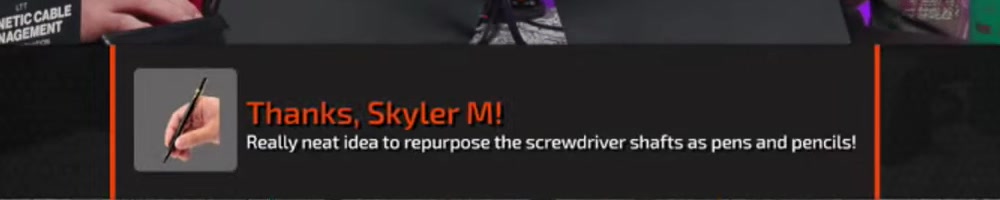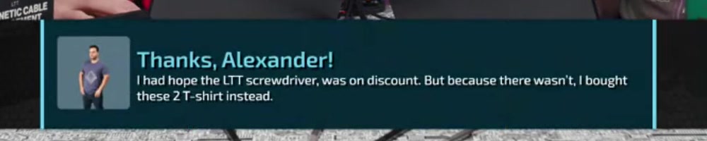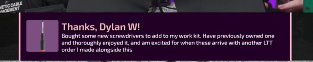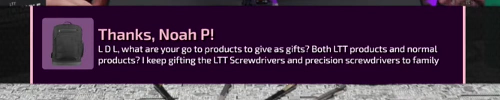 Noah P message Thanks, Noah P! LDL, what are your go to products to give as gifts? Both LTT products and normal products? I keep gifting the LTT Screwdrivers and precision screwdrivers to family Timestamp