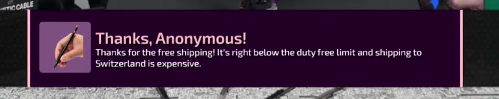 Anonymous message Thanks, Anonymous! Thanks for the free shipping! It's right below the duty free limit and shipping to Switzerland is expensive. Timestamp