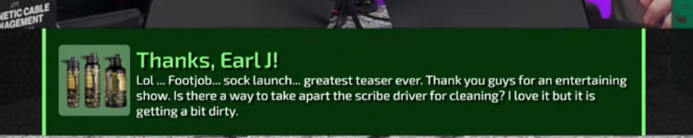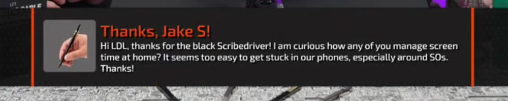 Jake S message Thanks, Jake S! Hi LDL, thanks for the black Scribedriver! I am curious how any of you manage screen time at home? It seems too easy to get stuck in our phones, especially around SOS. Thanks! Timestamp