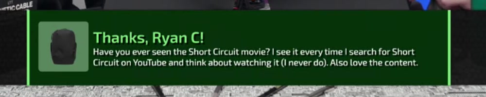 Ryan C message Thanks, Ryan C! Have you ever seen the Short Circuit movie? I see it every time I search for Short Circuit on YouTube and think about watching it (I never do). Also love the content. Timestamp