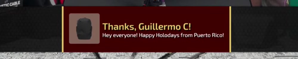 Guillermo C message Thanks, Guillermo C! Hey everyone! Happy Holodays from Puerto Rico! Timestamp