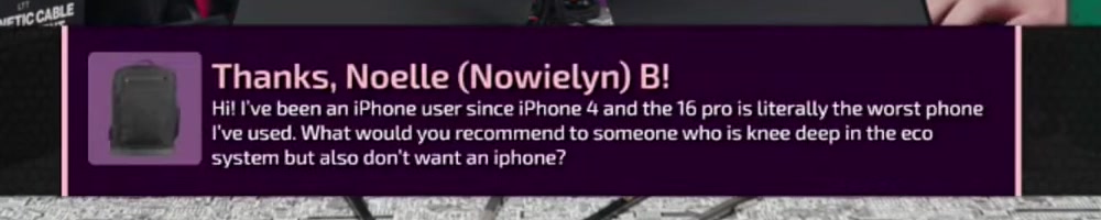 Noelle (Nowielyn) B message Thanks, Noelle (Nowielyn) B! Hi! I've been an iPhone user since iPhone 4 and the 16 pro is literally the worst phone I've used. What would you recommend to someone who is knee deep in the eco system but also don't want an iphone? Timestamp