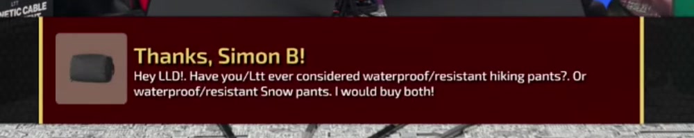 Simon B message Thanks, Simon B! Hey LLD!. Have you/Ltt ever considered waterproof/resistant hiking pants?. Or waterproof/resistant Snow pants. I would buy both! Timestamp