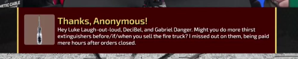 Anonymous message Thanks, Anonymous! Hey Luke Laugh-out-loud, DeciBel, and Gabriel Danger. Might you do more thirst extinguishers before/if/when you sell the fire truck? I missed out on them, being paid mere hours after orders closed. Timestamp