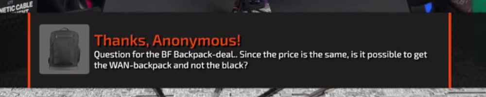 Anonymous message Thanks, Anonymous! Question for the BF Backpack-deal.. Since the price is the same, is it possible to get the WAN-backpack and not the black? Timestamp