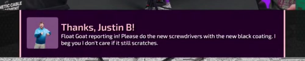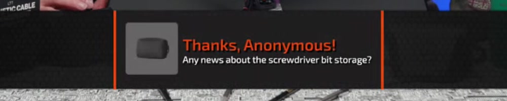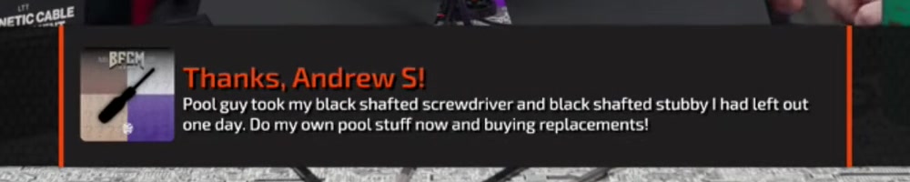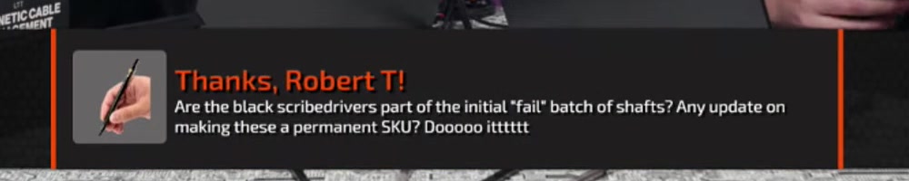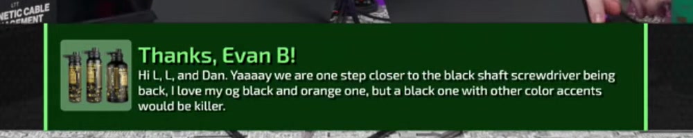 Evan B message Thanks, Evan B! Hi L, L, and Dan. Yaaaay we are one step closer to the black shaft screwdriver being back, I love my og black and orange one, but a black one with other color accents would be killer. Timestamp