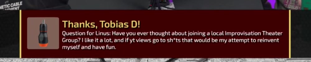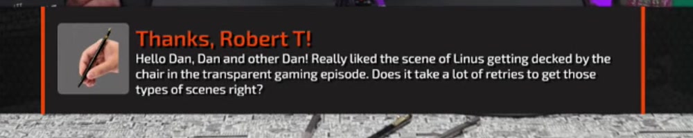 Robert T message Thanks, Robert T! Hello Dan, Dan and other Dan! Really liked the scene of Linus getting decked by the chair in the transparent gaming episode. Does it take a lot of retries to get those types of scenes right? Timestamp