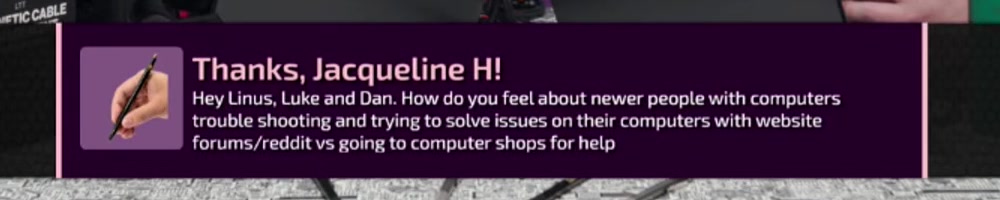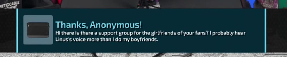 Anonymous message Thanks, Anonymous! Hi there is there a support group for the girlfriends of your fans? I probably hear Linus's voice more than I do my boyfriends. Timestamp