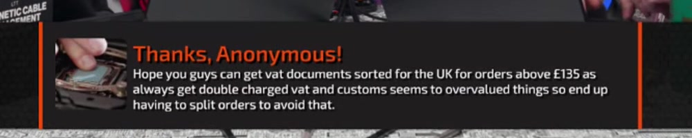 Anonymous message Thanks, Anonymous! Hope you guys can get vat documents sorted for the UK for orders above £135 as always get double charged vat and customs seems to overvalued things so end up having to split orders to avoid that. Timestamp