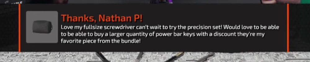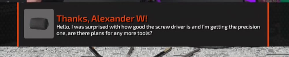 Alexander W message Thanks, Alexander W! Hello, I was surprised with how good the screw driver is and I'm getting the precision one, are there plans for any more tools? Timestamp