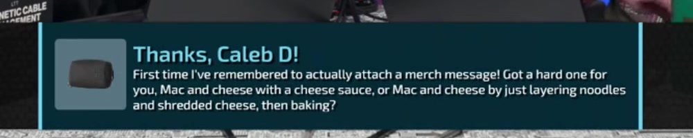 Caleb D message Thanks, Caleb D! First time I've remembered to actually attach a merch message! Got a hard one for you, Mac and cheese with a cheese sauce, or Mac and cheese by just layering noodles and shredded cheese, then baking? Timestamp