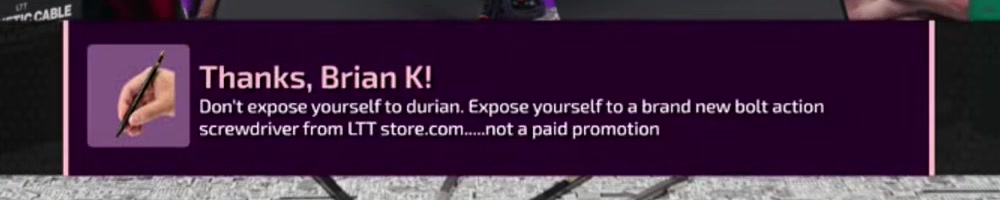Brian K message Thanks, Brian K! Don't expose yourself to durian. Expose yourself to a brand new bolt action screwdriver from LTT store.com.....not a paid promotion Timestamp