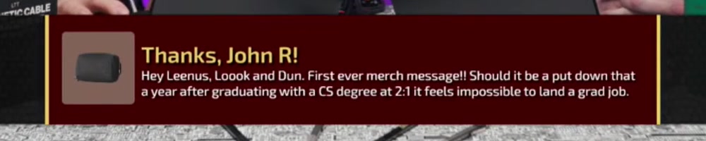 John R message Thanks, John R! Hey Leenus, Loook and Dun. First ever merch message!! Should it be a put down that a year after graduating with a CS degree at 2:1 it feels impossible to land a grad job. Timestamp