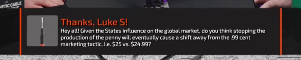 Luke S message Thanks, Luke S! Hey all! Given the States influence on the global market, do you think stopping the production of the penny will eventually cause a shift away from the .99 cent marketing tactic. I.e. $25 vs. $24.99? Timestamp