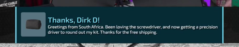 Dirk D message Thanks, Dirk D! Greetings from South Africa. Been loving the screwdriver, and now getting a precision driver to round out my kit. Thanks for the free shipping. Timestamp