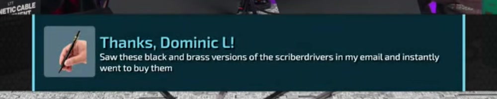 Dominic L message Thanks, Dominic L! Saw these black and brass versions of the scriberdrivers in my email and instantly went to buy them Timestamp