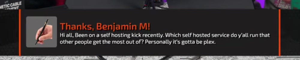 Benjamin M message Thanks, Benjamin M! Hi all, Been on a self hosting kick recently. Which self hosted service do y'all run that other people get the most out of? Personally it's gotta be plex. Timestamp