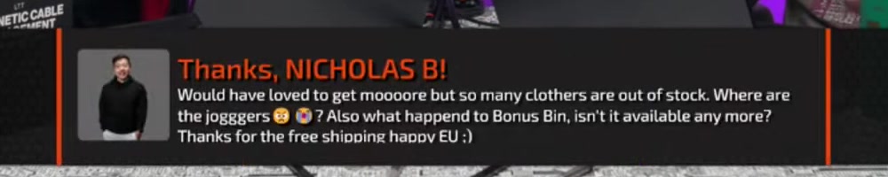 NICHOLAS B message Thanks, NICHOLAS B! Would have loved to get moooore but so many clothers are out of stock. Where are the jogggers ? Also what happend to Bonus Bin, isn't it available any more? Thanks for the free shipping happy EU :) Timestamp