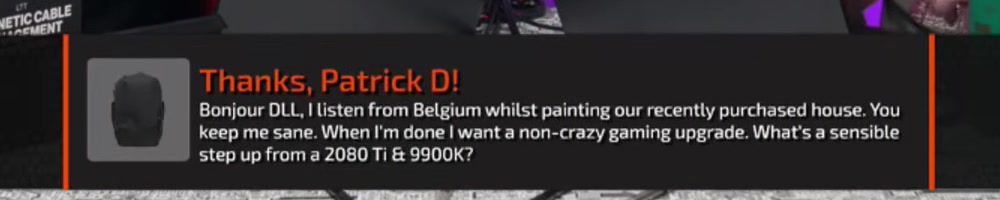 Patrick D message Thanks, Patrick D! Bonjour DLL, I listen from Belgium whilst painting our recently purchased house. You keep me sane. When I'm done I want a non-crazy gaming upgrade. What's a sensible step up from a 2080 Ti & 9900K? Timestamp